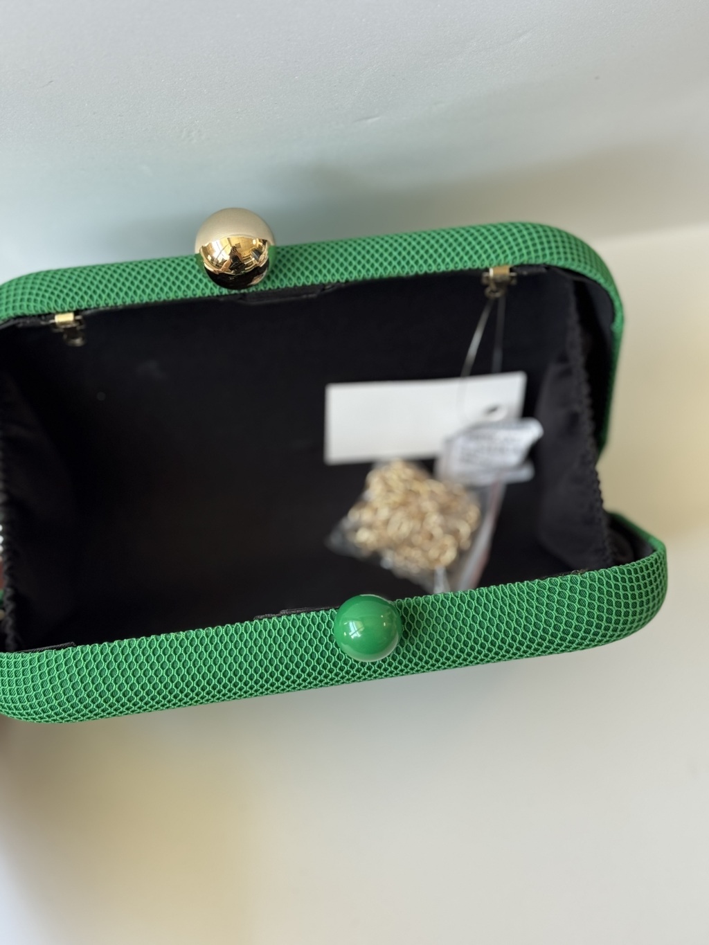 Bolsa Festa Clutch Verde Bandeira, inspira poder e sofisticação, formato aredondado, fecho magnético em metal dourado, forrada internamente, acompanha alça de corrente na cor dourada removível. Cabe iphone? Sim, cabe iphone versão normal e pro max, não cabe o iphone plus.
