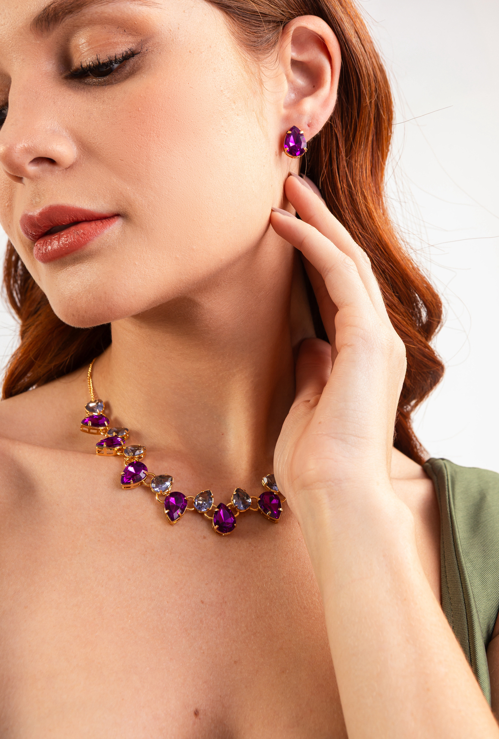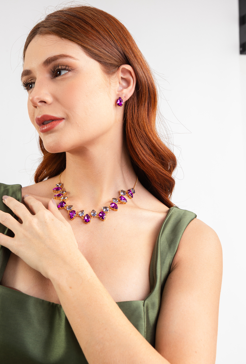 Conjunto Colar e Brinco de Festa mix roxo e lilás: encante-se com este conjunto de acessórios que une modernidade e elegância. O colar e brinco de modelo sofisticado com formato de gota e detalhes em banho dourado, destaca-se pelo design inovador, perfeito para qualquer ocasião especial ou para elevar seu visual. O conjunto é uma escolha certeira para valorizar sua beleza com discrição e sofisticação.
